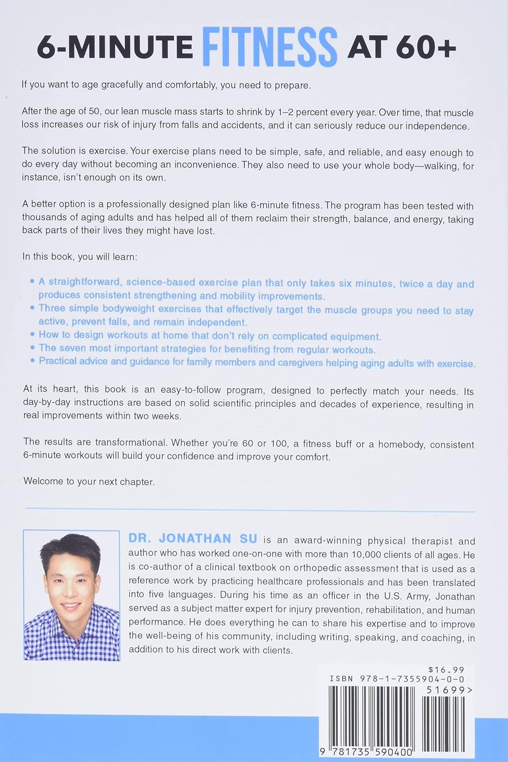 It doesn’t matter if you’re 60 or 100 years old, if your health is perfect or imperfect, or if you’re walking miles every day or struggling just to get up from a chair. 6-Minute Fitness at 60+ will show you how to transform your body and your life, no matter your current state of health and fitness.