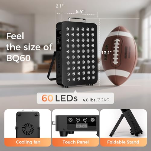 Durable, Hands-free Design: BQ60 dual-chip red light panel comes as a full package, includes user manual, hanging kit, and eye protection, complete with a built-in cooling fan to dissipate heat. The light therapy can be placed on a table or hung on the wall, providing a 17.2″ x 11.8″ therapy area at a 6-inch distance. Get the healthy benefits while you are working, relaxing or lying down.