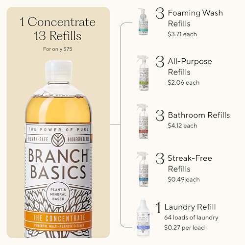 REUSE & REFILL FOR SUSTAINABLE CLEANING: Keep your cleaning routine sustainable by refilling the Branch Basics cleaning bottles (sold separately) with Concentrate! Simply add water and Concentrate to create more cleaning solutions, reducing waste while maintaining a safe and effective home environment. One bottle of Concentrate can create multiple cleaning products at different dilution ratios, making it a sustianable and cost-effective way to maintain your cleaning routine.