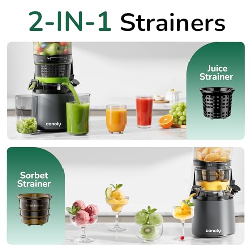 Canoly C16 Cold Press Juicer, 6″ Extra Wide Feed Chute, 3-IN-1 Strainers (Juice & Sorbet & Nut Milk), Powerful AC Brushless Motor, Self Precut System, Juicer Machines with BPA-Free (Space Gray)