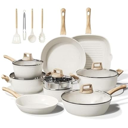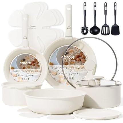 CAROTE 19pcs Pots and Pans Set Non Stick, Cookware Sets, Kitchen Set, Oven/Fridge Safe, Space Saving Pots Set, Nonstick Cooking Set with Versatile Detachable Handle, Induction RV Set, Cream White