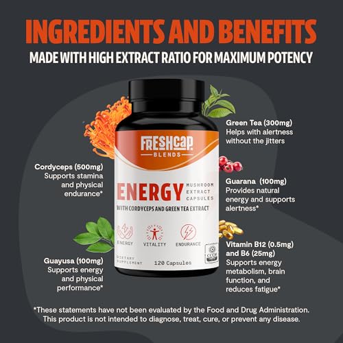 FreshCap 5-in-1 Energy Supplements, Energy Supplements for Women and Men, Energy Boosters for Fatigue, Energy Support, Cordyceps Extract, Ayurveda Cordyceps Mushroom Blend Capsules (120 Capsules)