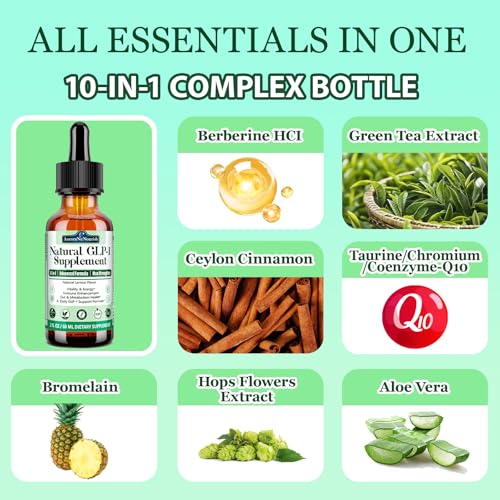 10-In-1 Scientifical GLP-1 support Formula: 10-In-1 GLP1 Supplements for women & men are rich in 10 natural herbal active Ingredients. Just one dropper can enjoy the health brought by Cellulose Fiber 500mg & Berberine HCI 200mg, Green Tea Extract 400mg, Bromelain, Chromium, Aloe Vera, Hops Flower Extract, Ceylon Cinnamon, Taurine, Coenzyme-Q10. Each effective ingredient in our glp 1 supplement has been carefully selected based on its active effects on cravings, activating GLP-1, digestion harmony & metabolic wellness*