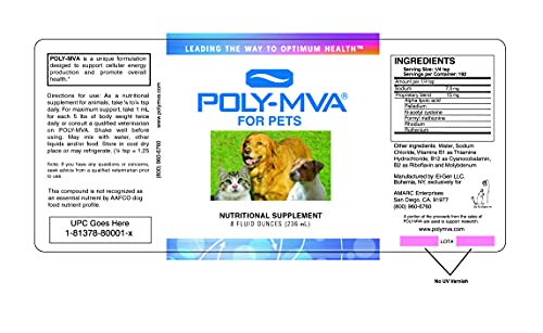 Poly-MVA for Pets is a specially formulated combination of vitamins, minerals and amino acids designed to promote the overall health of your pets. Available in 8 fluid oz. or 4 fluid oz.
