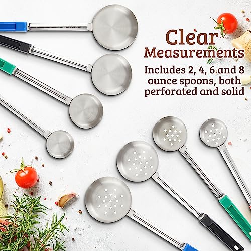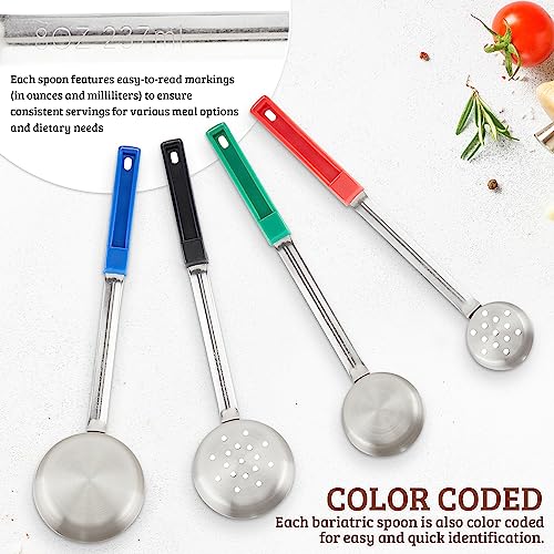 Comprehensive 8-Piece Set: Includes 4 solid and 4 perforated stainless steel serving utensils, designed to support portion control for bariatric surgery patients, weight loss, and healthy lifestyles. portion control serving spoons set includes 2, 4, 6 and 8 ounce spoons, both perforated and solid. Baricatric Must Haves for sure.