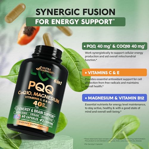 PQQ 40 mg – PQQ with CoQ10 Supplement – Mitochondria Biogenesis & Cellular Energy Production – with Magnesium, Vitamins C, E & B2 – Pure & Highly Bioavailable | Lab Tested – Made in USA – 60 Capsules