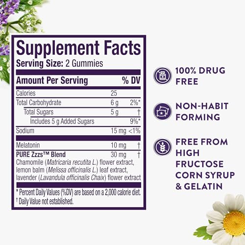 ZzzQuil PURE Zzzs Advanced 10mg Melatonin gummies work naturally with your body’s natural sleep cycle.* If you’ve been struggling with occasional sleeplessness, whether it’s caused by a schedule change, stress, or restless thoughts, consider trying a melatonin supplement! ZzzQuil Advanced Melatonin 10mg gummies are a great choice when you’re dealing with occasional sleeplessness, because they are drug-free and non-habit forming. These melatonin gummies also contain no gelatin and no high fructose corn syrup. This sleep aid work naturally with your body to help you fall asleep.* These fast-acting melatonin gummies^ are delicious, berry flavored. They also contain our unique complementary botanical blend. The botanical blend is a unique fusion of chamomile, lavender, and lemon balm. These fast-acting melatonin gummies^ also have 5x more melatonin compared to PURE Zzzs Melatonin Gummies. From the World’s #1 Sleep Aid Brand.† Better days start with ZzzQuil Nights and ZzzQuil PURE Zzzs Advanced 10mg Melatonin Gummies. ^vs. placebo. *These statements have not been evaluated by the Food and Drug Administration. This product is not intended to diagnose, treat, cure, or prevent any disease. †Source Euromonitor International Limited; Consumer Health 2024 Edition; Sleep Aids, all channels, retail selling price, Global Brand Name ZzzQuil 2023 data